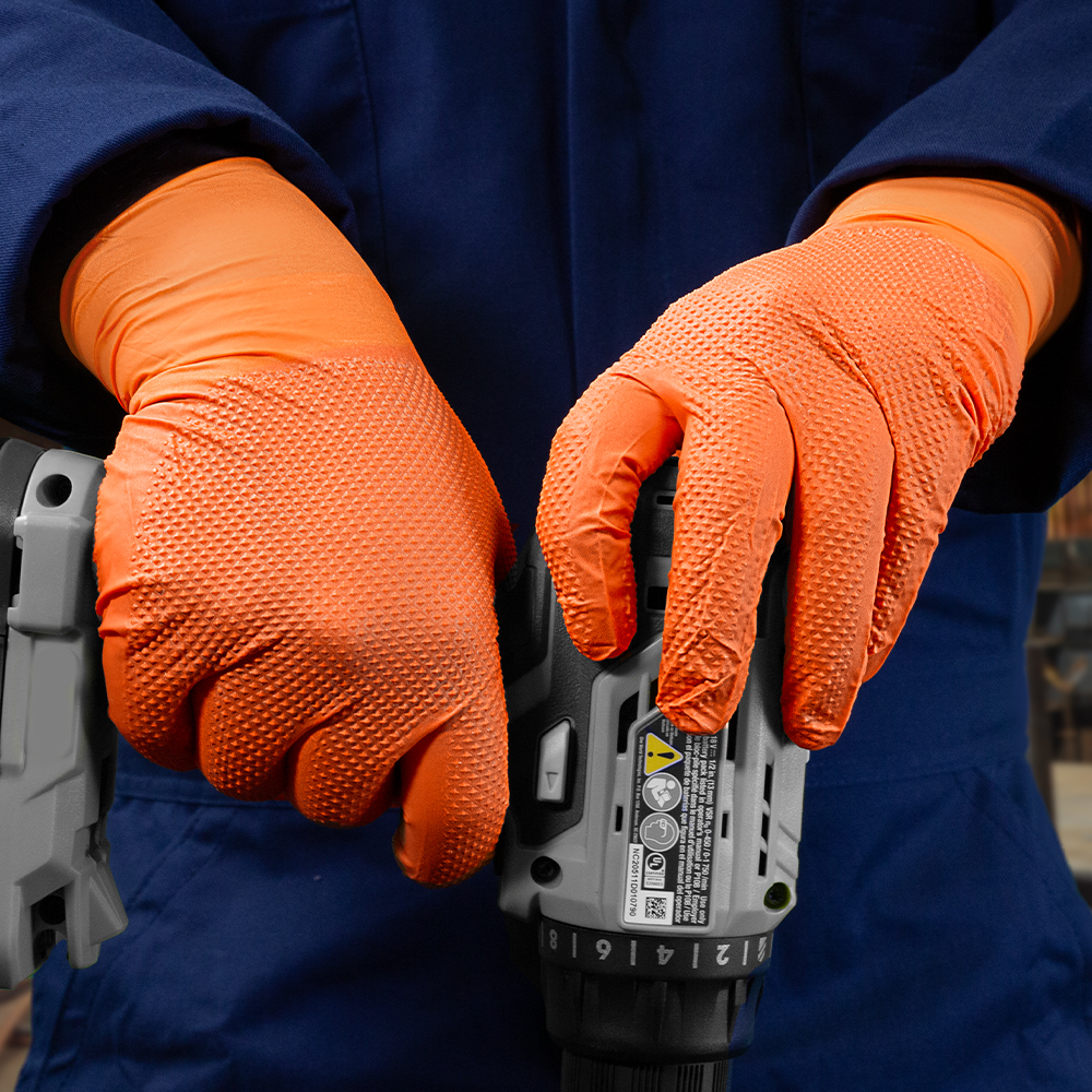 Gloveworks ULTRA™ Industrial Orange Flock-Lined Raised Diamond Texture nitrile disposable gloves are built for tough industrial jobs, offering durability, comfort, and performance. The sweat-absorbing flock lining combined with the raised diamond texture enhances airflow to keep hands cool and dry during extended use, while creating 60% more surface area for superior liquid-channeling grip. This design provides a more comfortable and secure fit compared to non-textured or non-flock-lined gloves, without compromising protection. These gloves also deliver excellent chemical and puncture resistance and are completely latex free, making them suitable for users with latex sensitivities.